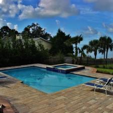 Pool Designs of Florida installed the gunite pool and we suggested a Tremron Hardscapes product called Bluestone for the pool decking as well as the walkways leading to the Anchor Highland Stone Fire Pit. Bluestone has the look of natural stone that the client wanted without the cost associated with travertine. It also has 3 block sizes and looks amazing! We tied it all together with a paver pool coping also from Tremron.