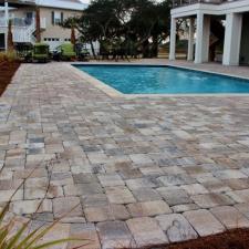 Our customer pretty much knew exactly what he wanted. The Wallace Company designed pool deck and walkways with simple but functional landscape. All pavers for driveway and pool deck were basically picked because customer liked a certain color, not necessarily a style. After looking at several completed projects, customer chose Belgard Appian Stone color “Napoli”, for pool deck and driveway. To compliment the deck we chose a Bullnose Travertine coping manufactured by Tremron. When doing a landscape on Pensacola Beach, salt water and wind are our biggest obstacles. All plants and trees were carefully thought out so we would have very little problems. When choosing turf, the same things apply, Empire Zoysia was the best for this location. Grading and Irrigation also make the landscape all work together. A custom designed Irrigation System and hours on a skid steer with 220 cu yds of white pre approved beach sand make this project simple, but long lasting. In order to see this beautiful project at night, Alliance low voltage LED lighting was designed and installed for years of enjoyment.